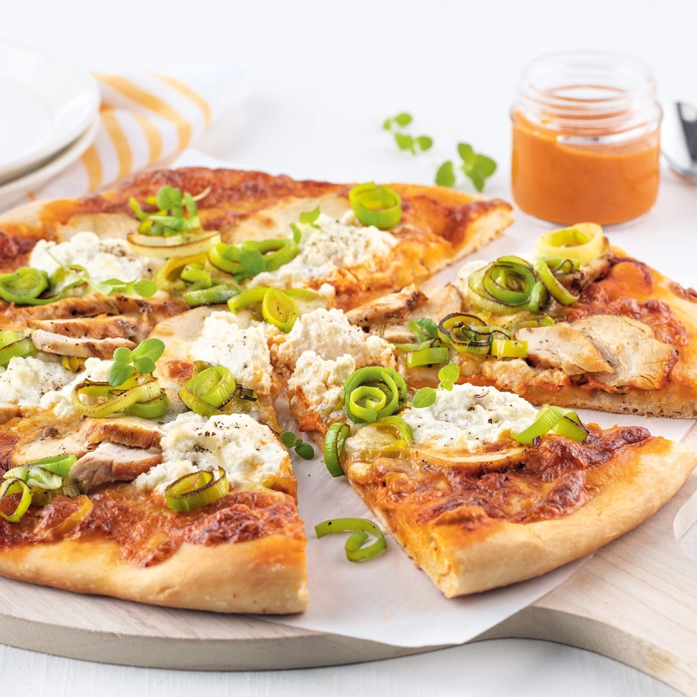 - Top the dough with pesto, chicken, leek, ricotta and mozzarella. Season with pepper.