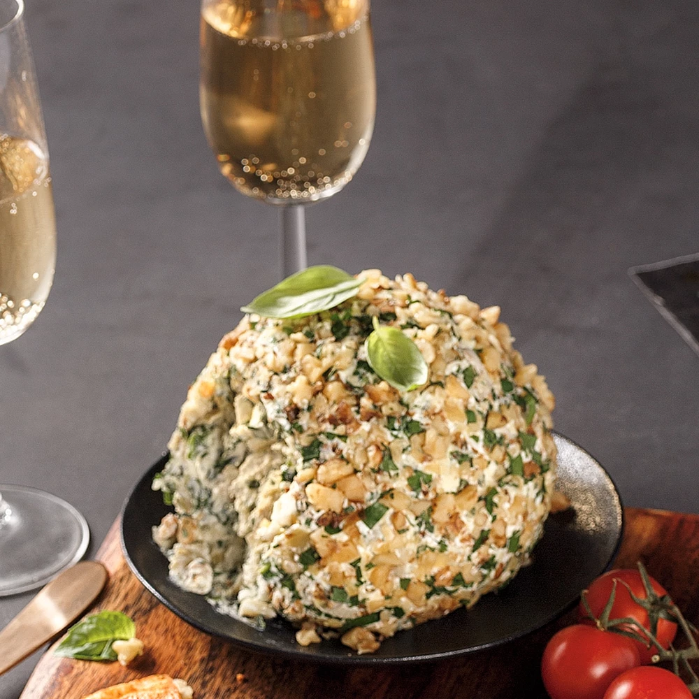 4. Dans une assiette creuse, mélanger le reste du basilic avec les noix de Grenoble. Rouler la boule au fromage dans la préparation aux noix. 5. Réfrigérer jusqu’au moment de servir.