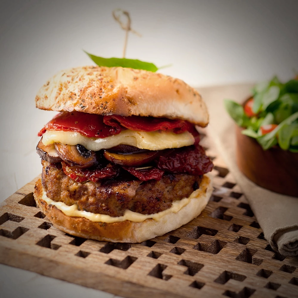 Burger de veau aux tomates séchées et poivrons rôtis
