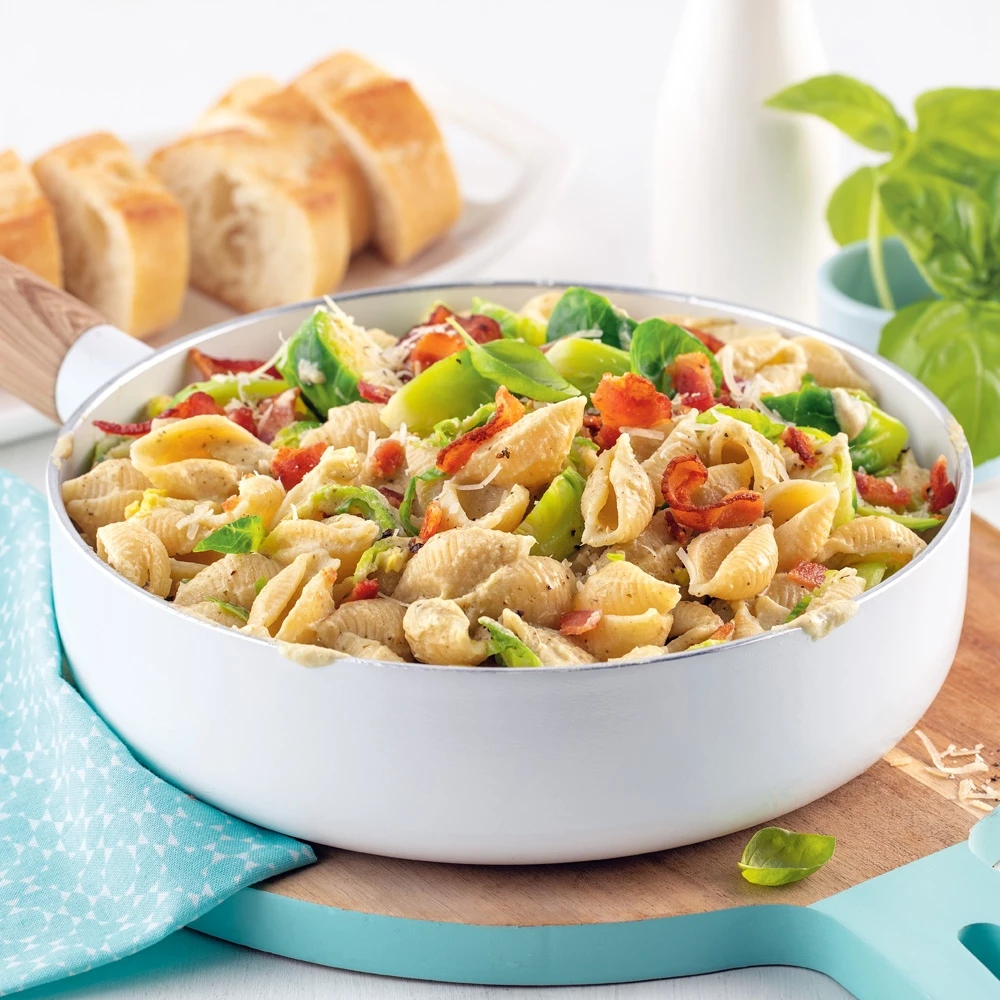 - Ajouter les coquilles, les choux de Bruxelles, le bacon et le parmesan dans la casserole. Poivrer et remuer.