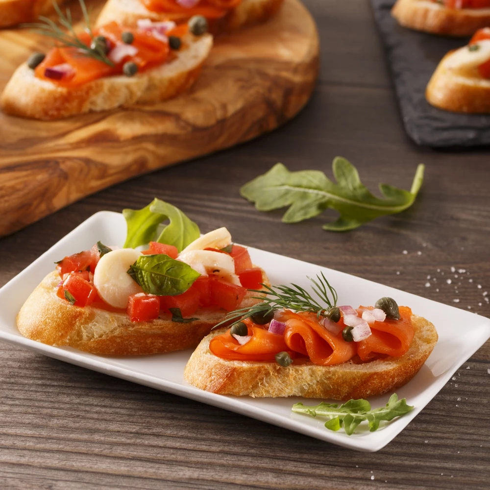 7. Sur la moitié des croûtons, répartir le saumon fumé et le mélange de câpres. Garnir de petites tiges d’aneth.