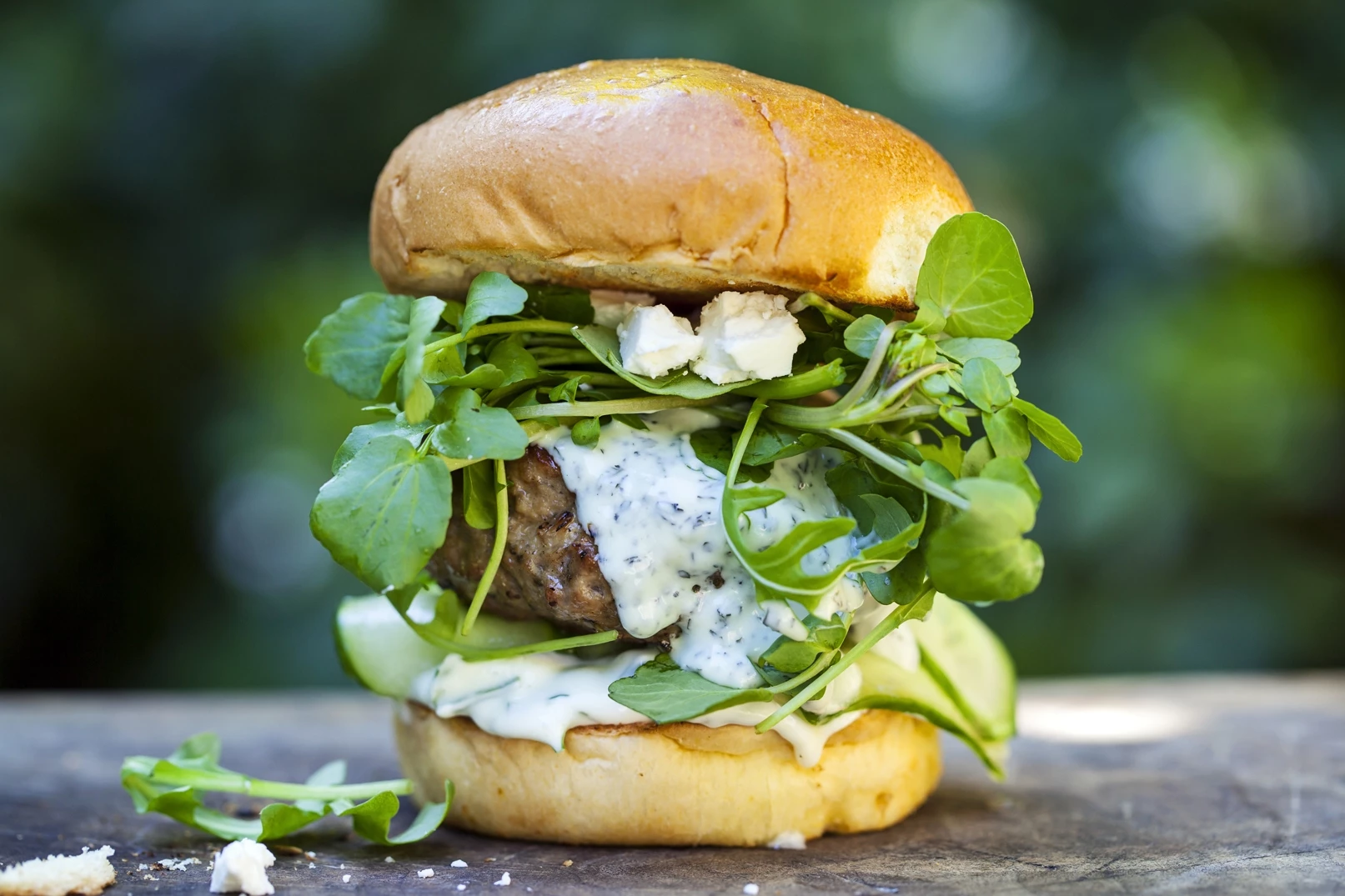 Étaler une généreuse quantité de sauce à la menthe et ail sur la moitié inférieure du pain brioché et ajouter une couche de concombres finement tranchés. Déposer ensuite la galette d'agneau cuite, un bouquet de cresson, de la feta émiettée et recouvrir de l'autre moitié du pain brioché.