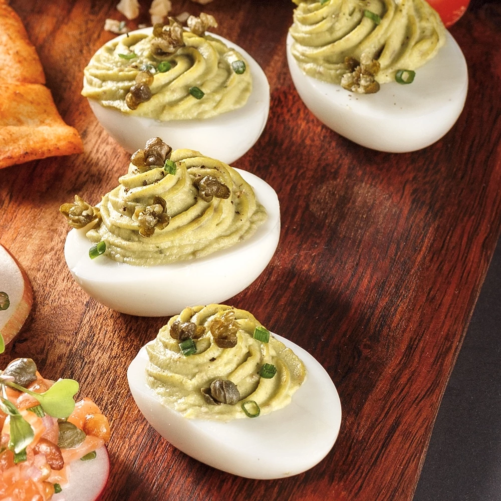 5. Remplir une poche à pâtisserie munie d’une douille cannelée de la préparation à l’avocat. Garnir les blancs d’œufs de la préparation.