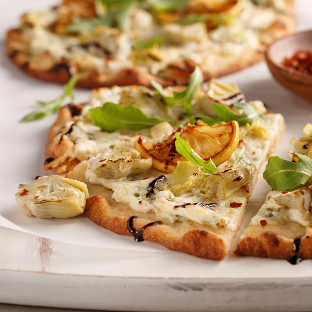 - Étaler la préparation au fromage à la crème sur les pains naan. Garnir les pains de mini cœurs d’artichauts. Cuire au four de 10 à 12 minutes.