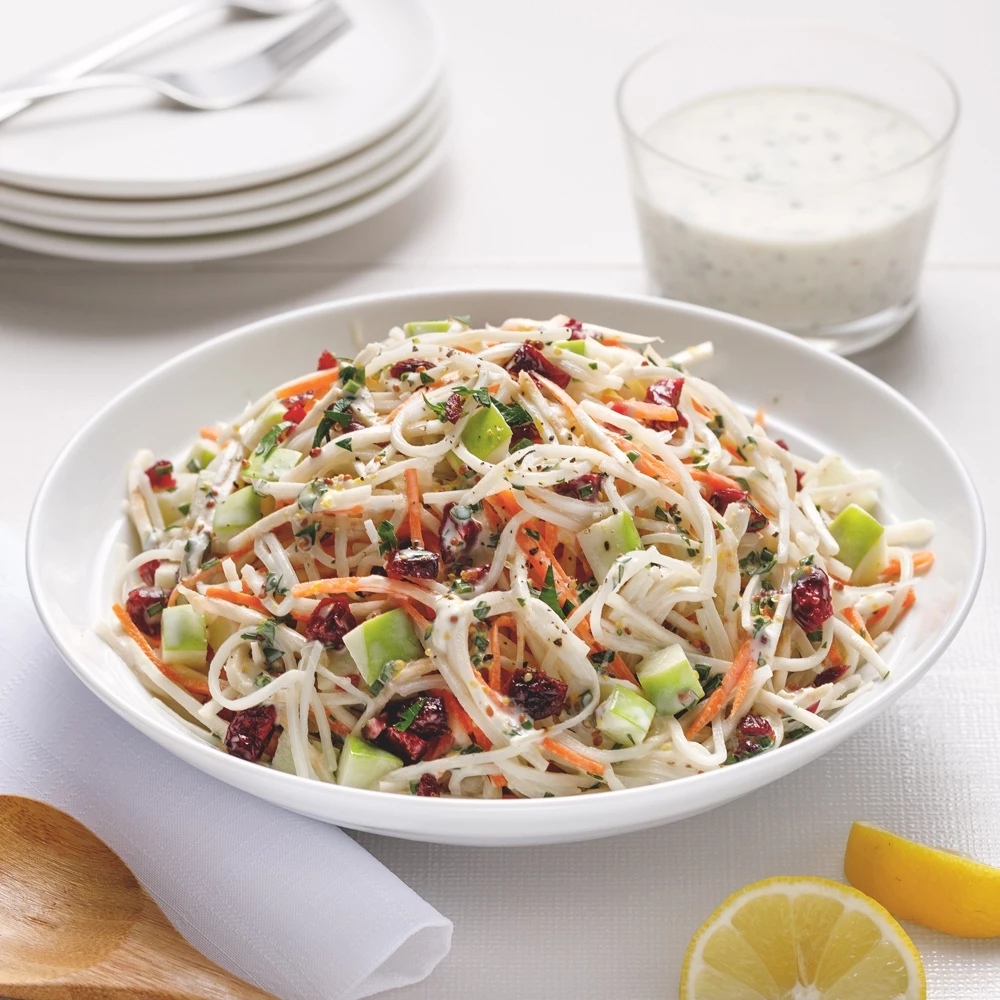 3. Ajouter les carottes, le céleri-rave, les pommes, les cœurs de palmier et les canneberges dans le saladier. Saler, poivrer et remuer.