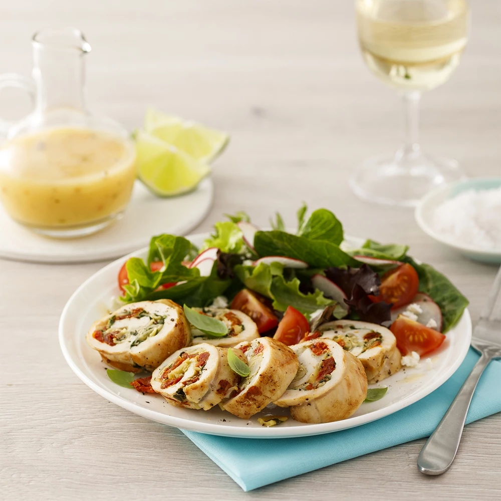6. Répartir la préparation aux artichauts sur les poitrines de poulet. Rouler les poitrines en serrant. Ficeler.