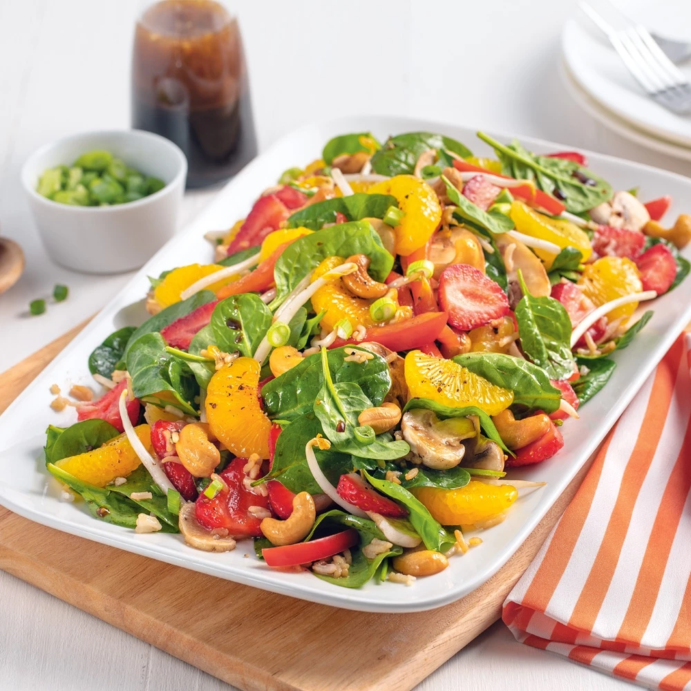 - Ajouter les Ă©pinards, les fraises, les fèves germĂ©es, le riz, les champignons, les noix de cajou, le poivron et les quartiers de pamplemousse dans le saladier.Â