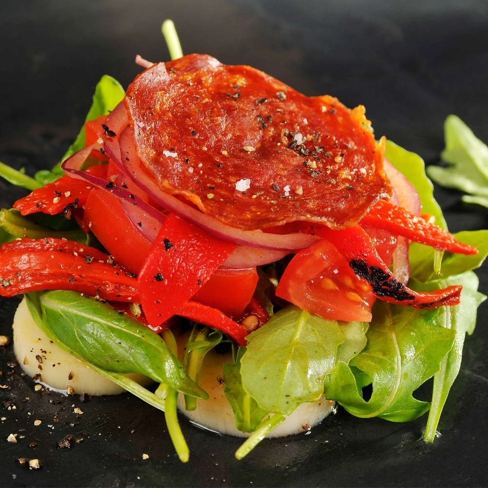 7. Dresser la salade dans les assiettes et garnir de chips de saucisson.
