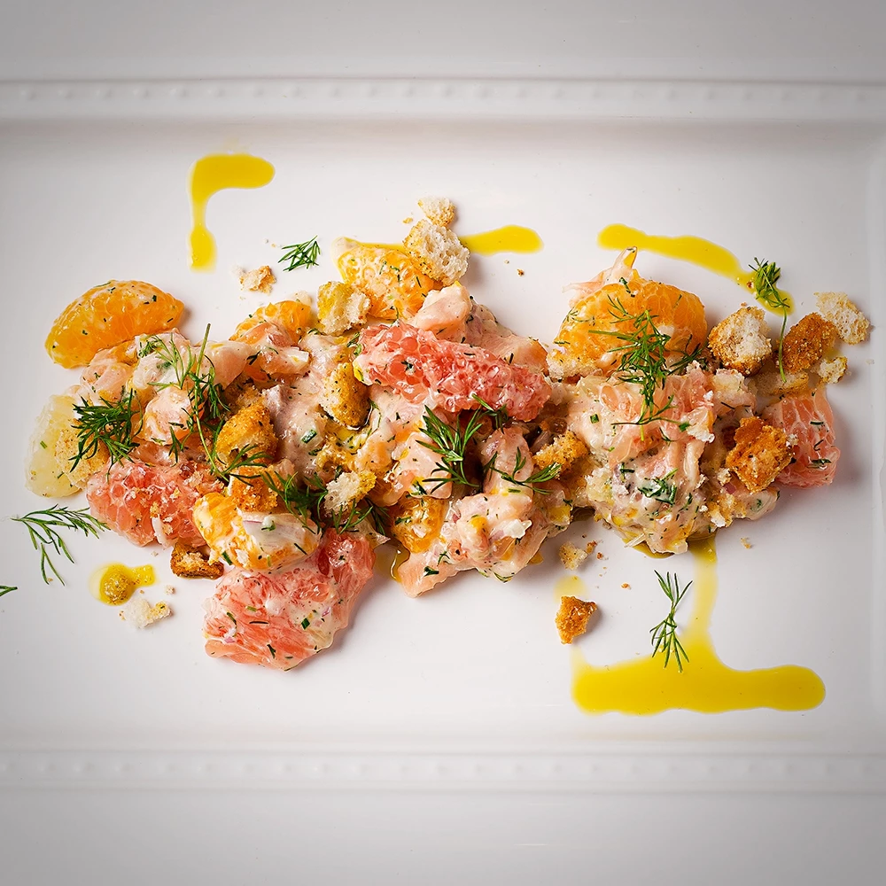 2. À l'aide d'un couteau bien affûté, couper le saumon en cubes et l’incorporer au mélange précédent.