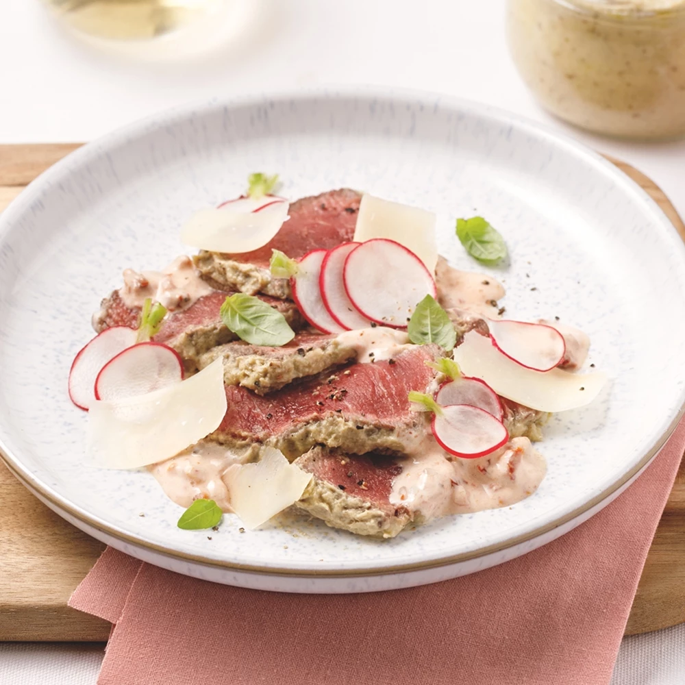 6. Au moment de servir, trancher finement les filets mignons dans le sens contraire des fibres. Répartir les tranches dans quatre assiettes et napper de mayonnaise parfumée.