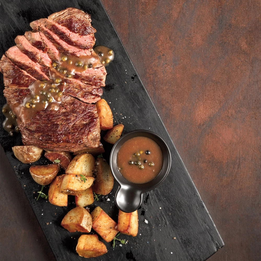 6. Déposer les bavettes tranchées dans les assiettes, arroser de sauce. Servir avec vos accompagnements préférés.