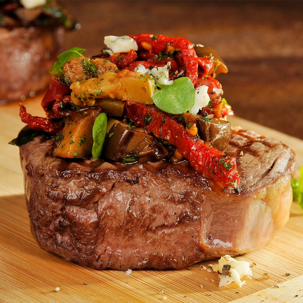 3. Garnir chacun des biftecks de salsa de légumes et servir sans attendre.