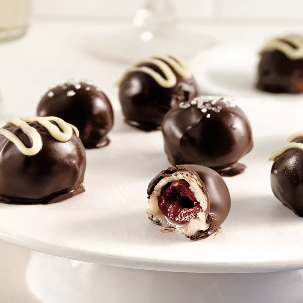 7. Tremper rapidement les boules dans le chocolat, puis les déposer sur la plaque. Réfrigérer 1 heure.
