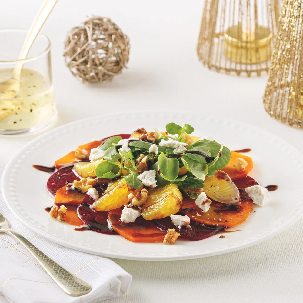 - Dans huit petites assiettes, disposer les tranches de betteraves en rosace en faisant alterner les couleurs. Répartir les quartiers de pamplemousses sur les betteraves, puis verser la vinaigrette en filet.