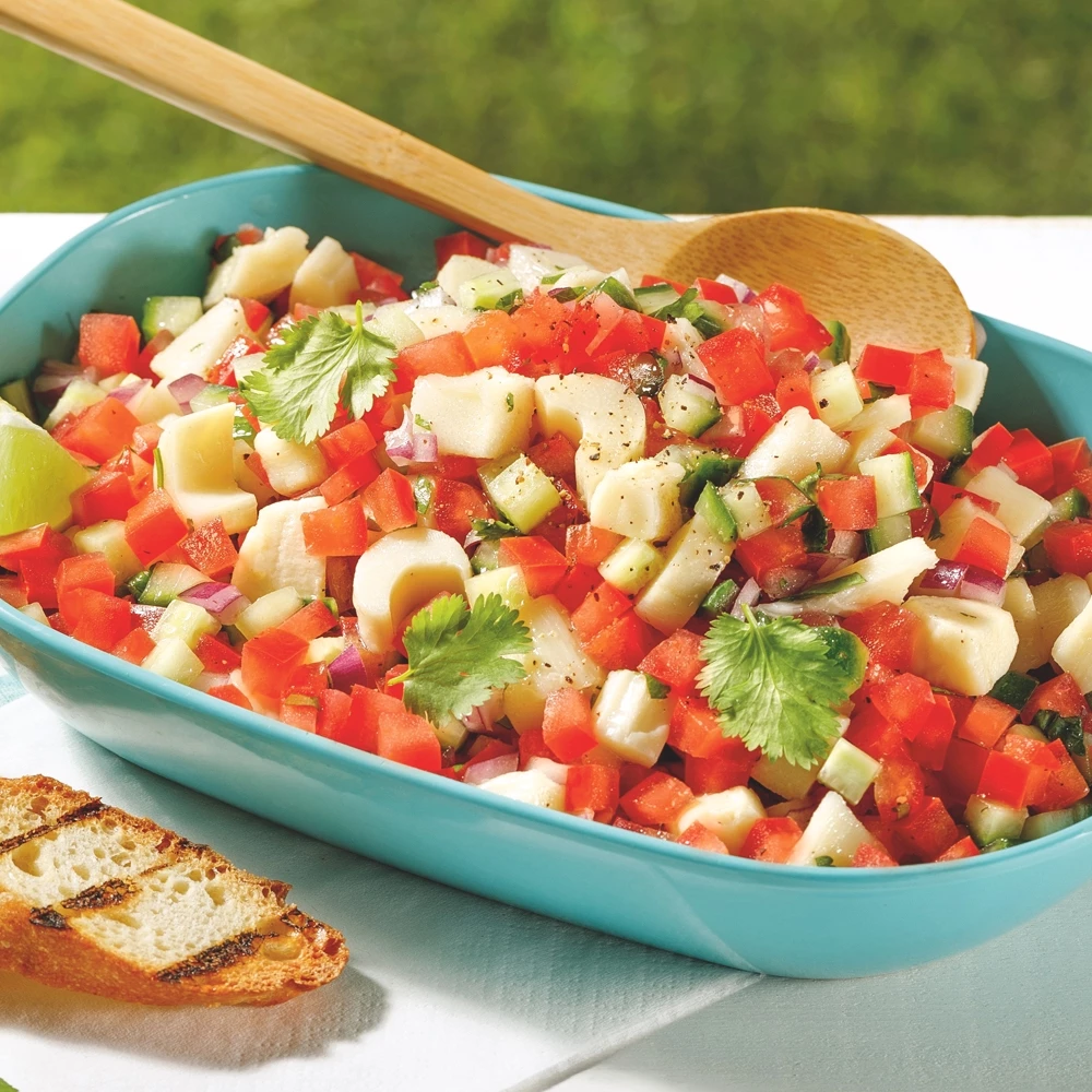 Étapes de préparation Dans un saladier, mélanger les ingrédients de la vinaigrette.Couper le concombre, l’oignon et les tomates en dés.Ajouter les cœurs de palmier et les légumes dans le saladier. Saler, poivrer et remuer.