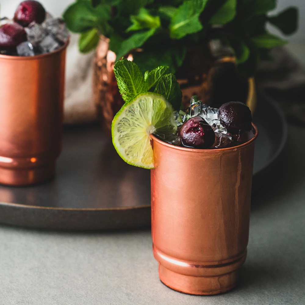1- Mélanger le jus d'une demie lime et les cerises bing M'Lord dans une tasse en cuivre.