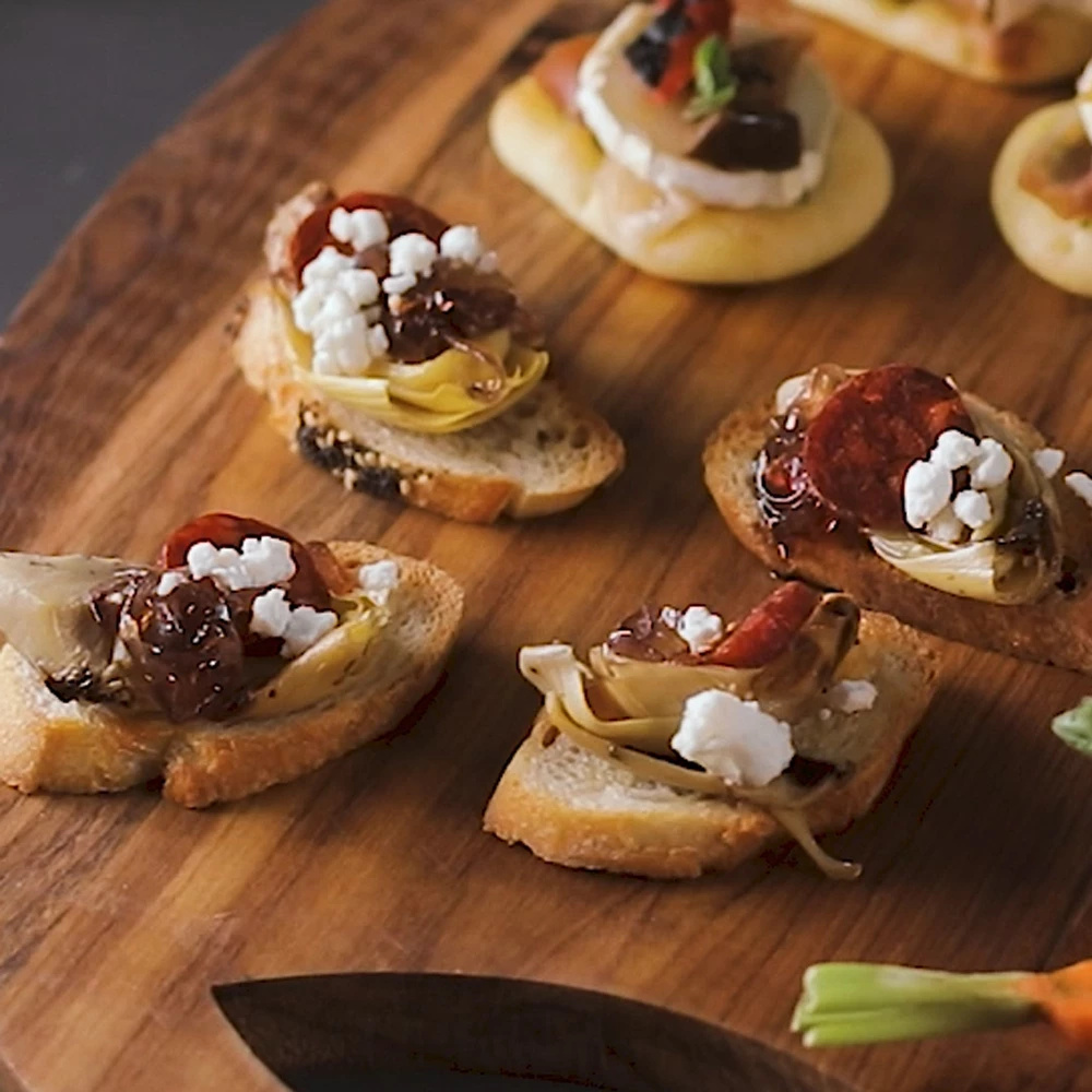 Étapes de préparation Garnir les croûtons d’oignons caramélisés, de cœurs d’artichaut, de chorizo et de feta.