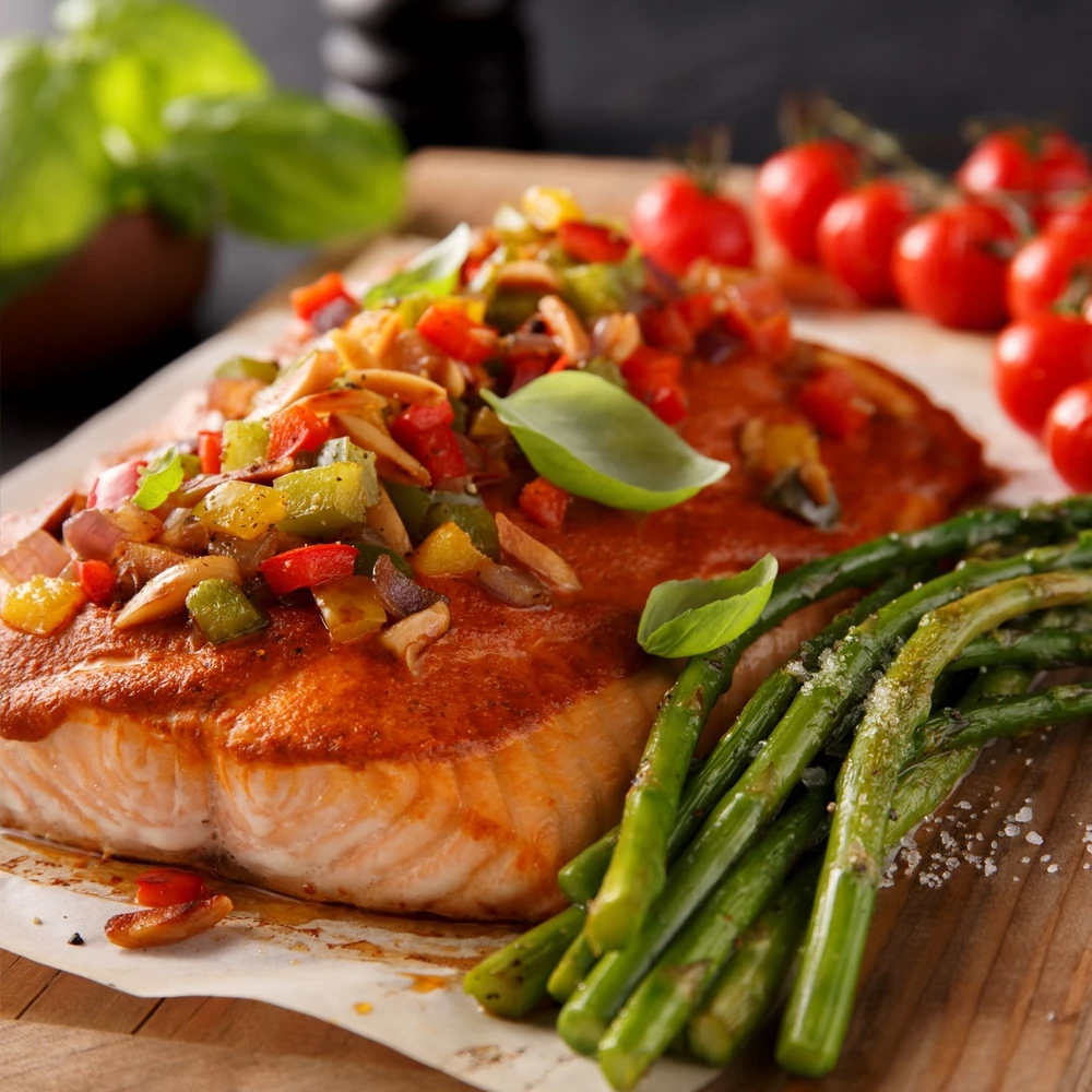 - Sur une plaque de cuisson tapissée de papier parchemin, déposer le filet de saumon. Tartiner le filet de saumon avec le pesto piquillo et amandes.
