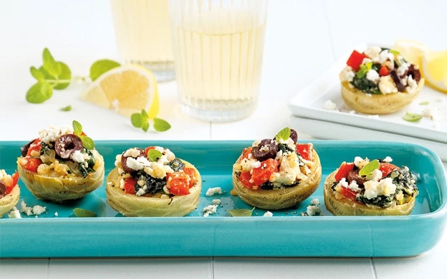 6. Au moment de servir, garnir les fonds d’artichaut de la feta restante.