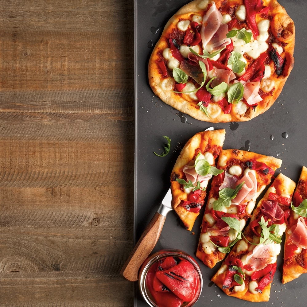 2. Badigeonner le pain naan de pesto, puis garnir de poivrons grillés, de bocconcinis et de prosciutto.