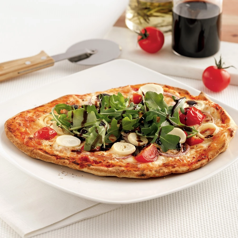 5. À la sortie du barbecue, garnir les pizzas de roquette. Arroser d’un filet d’huile d’olive et de vinaigre de balsamique.