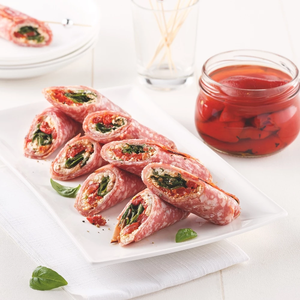 2. Sur le plan de travail, déposer deux tranches de salami côte- à -côte, en les superposant légèrement. Couvrir d’une tranche de jambon. Tartiner un peu de préparation à la ricotta sur le jambon. Garnir d’un peu de piments grillés et de roquette, puis d’une feuille de basilic. Ajouter un peu de pesto de tomates séchées.