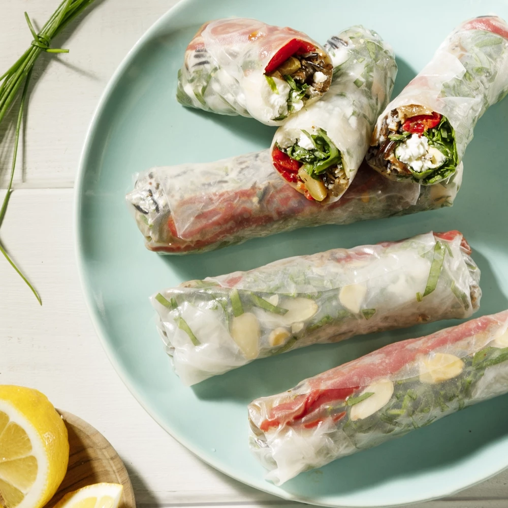 4. À environ 2,5 cm (1 po) du rebord de la feuille, déposer un peu de riz sauvage, de légumes grillés, de fromage de chèvre, d’amandes et de bébés épinards. Replier les côtés de la feuille de riz sur la garniture et rouler en serrant. Confectionner le reste des rouleaux en procédant de la même manière.