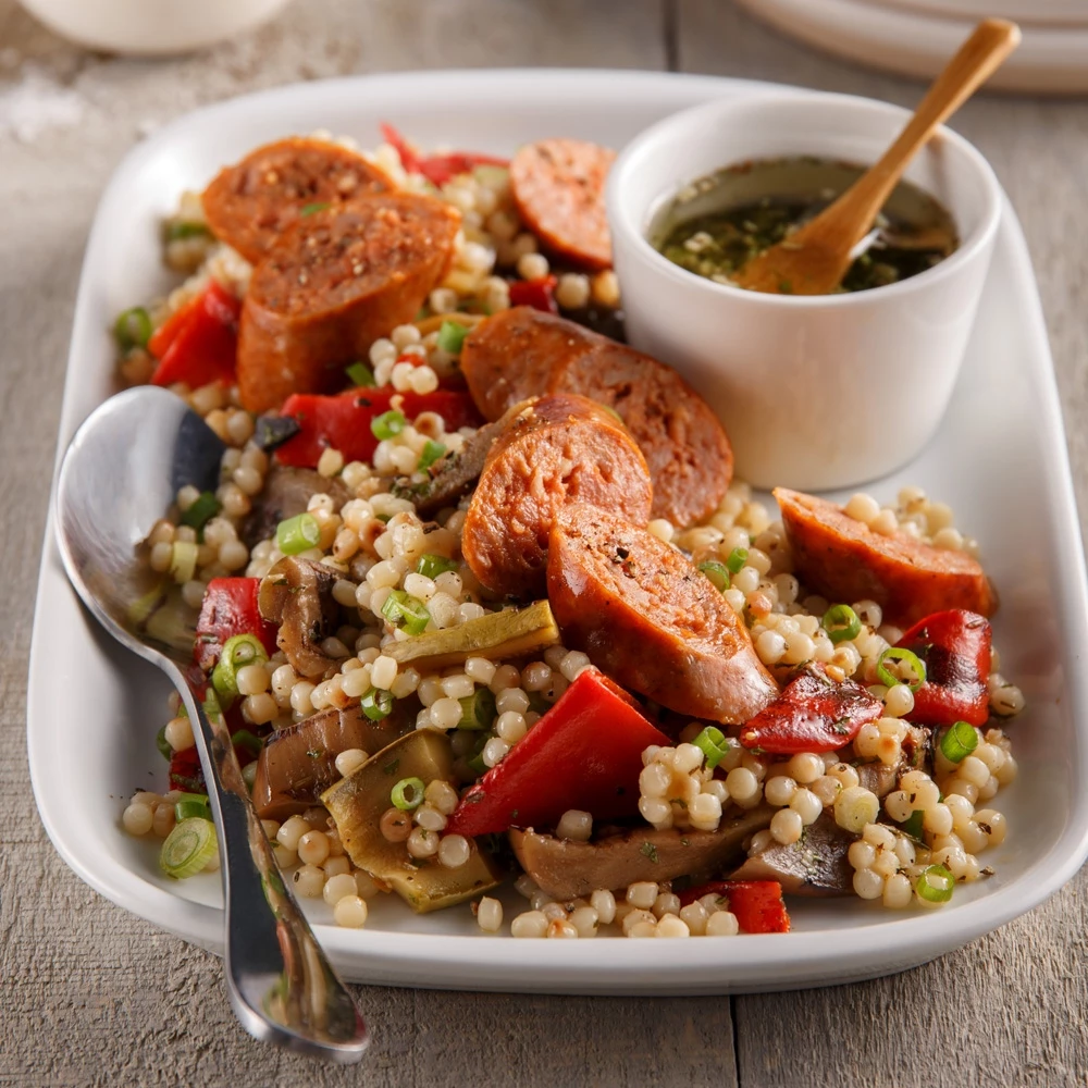 - Ajouter le couscous, les légumes grillés, les saucisses et les oignons verts dans le saladier. Saler, poivrer et remuer.