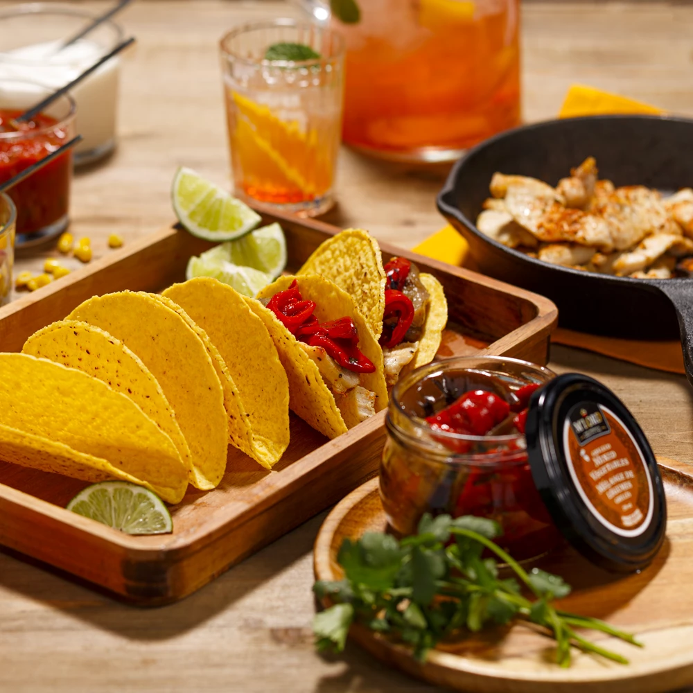 - Garnir les coquilles à tacos de chair à saucisses italiennes cuites, de mélange de légumes grillés M’LORD et les oignons rouges.