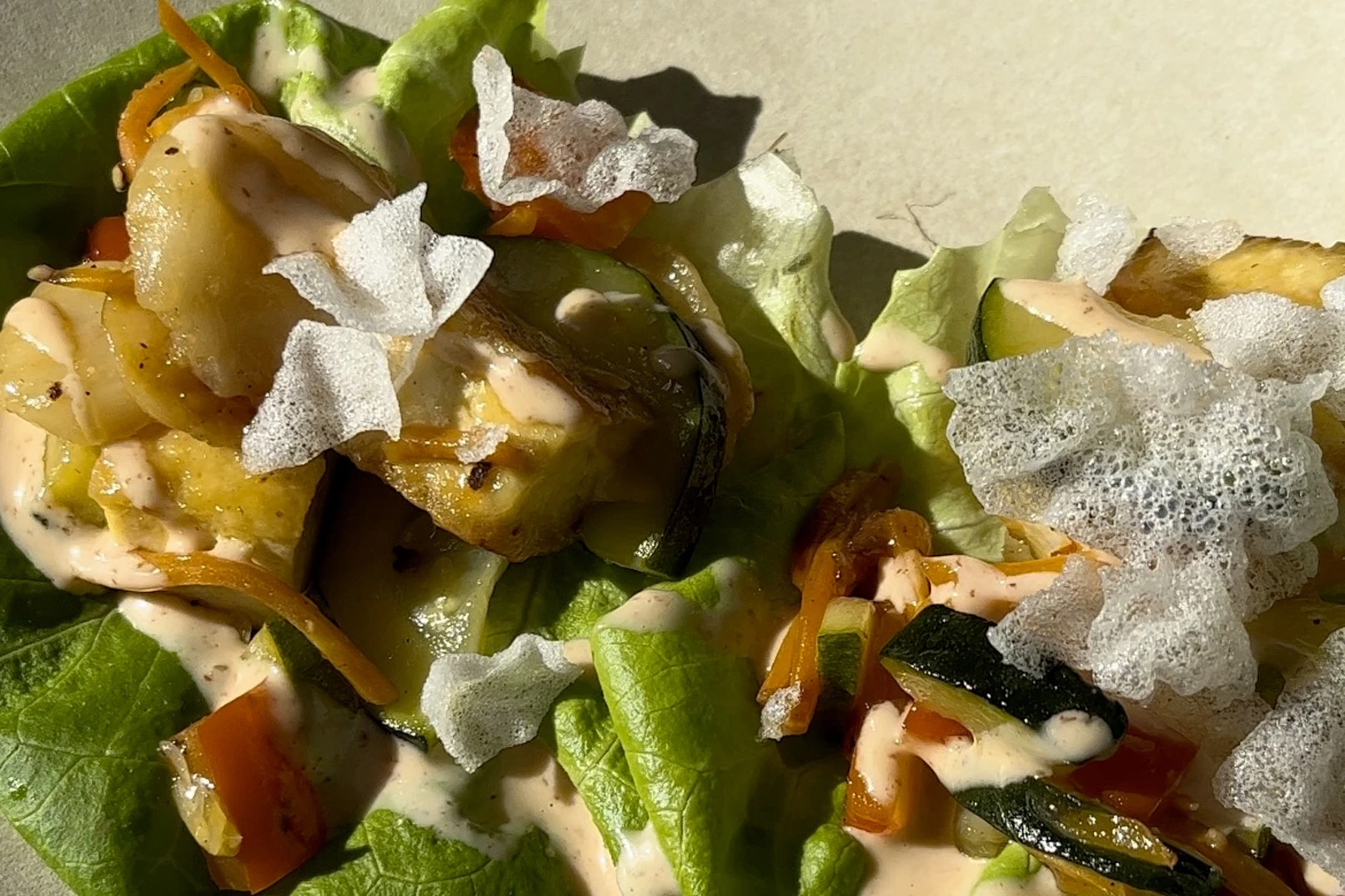 4. Mélanger le tofu aux légumes avec le piment doux, placer sur les feuilles de laitue et garnir de chips de wonton